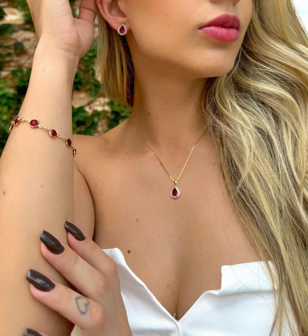 3297 Conjunto: corrente medindo 45cm de comprimento com pingente em zircônia formato gota medindo 1cm com bordas cravejadas em micro zircônias na cor cristal e brincos no mesmo formato e tamanho