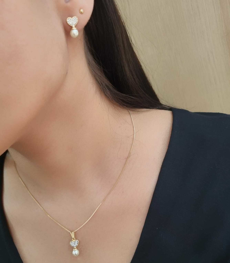 3405 Conjunto: corrente medindo 45cm de comprimento om pingente pérola de 4mm e coração em zirconia na base e so brincos no mesmo modelo.