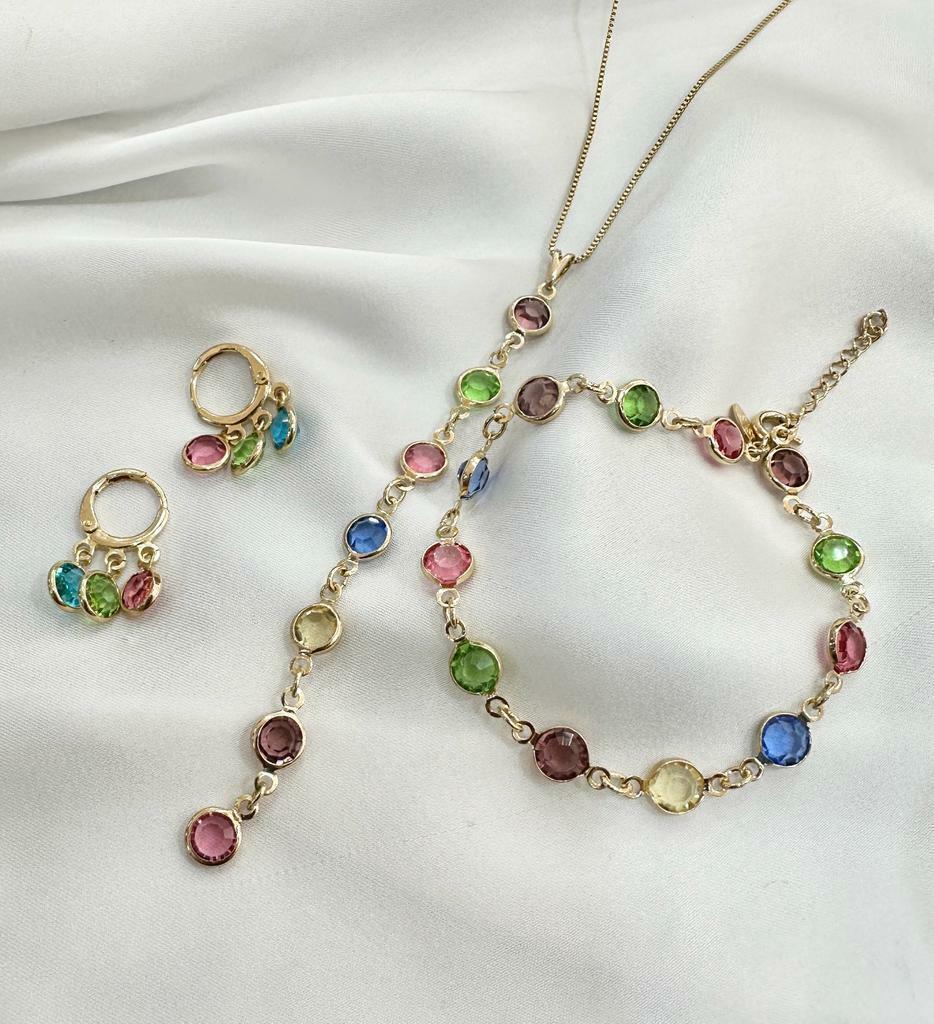 Conjunto Colors Gargantilha, Brinco e Pulseira Colorido Banhado a Ouro 18K