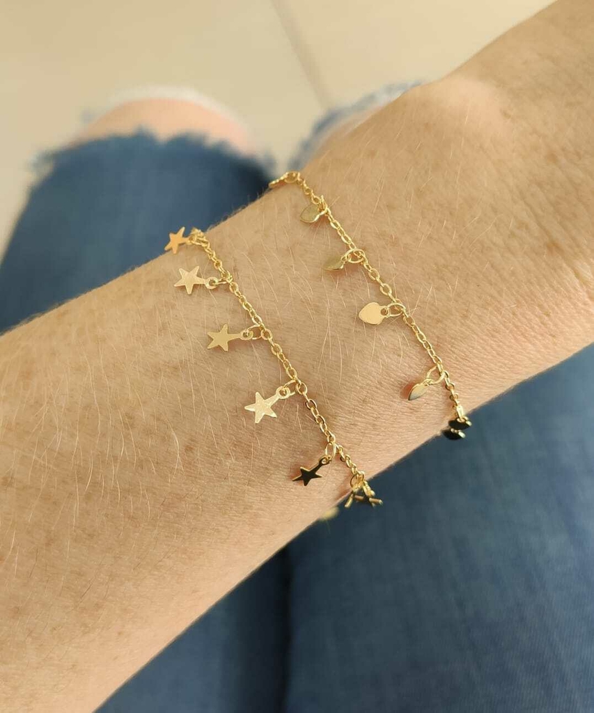 Pulseira elo português fio 0.50 com vários corações pendurados medindo 18cm + 3cm de extensor (regulável) (6712)