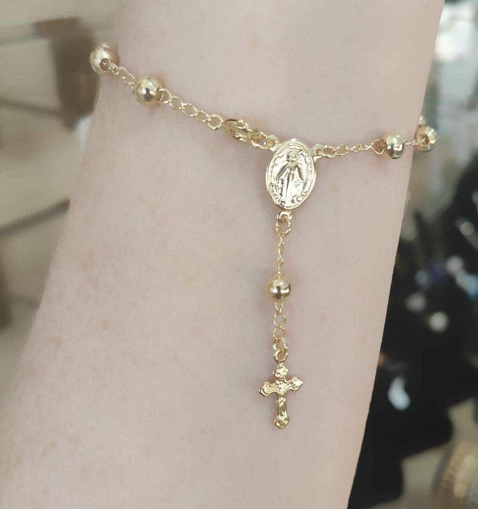 A pulseira terço faz parte da Coleção Religiosidade da Mariah Store Semijoias por ser um símbolo de devoção e fé que representa uma conexão com o Divino é um dos modelos mais vendidos em nossa loja, com brilho e delicadeza essa pulseira é essencial para complementar seu look, você pode fazer uma combinação com brincos e colares de cruz ou então com imagem do Espírito Santo. Banhada em ouro 18k tem um brilho perfeito para destacar a pulseira.